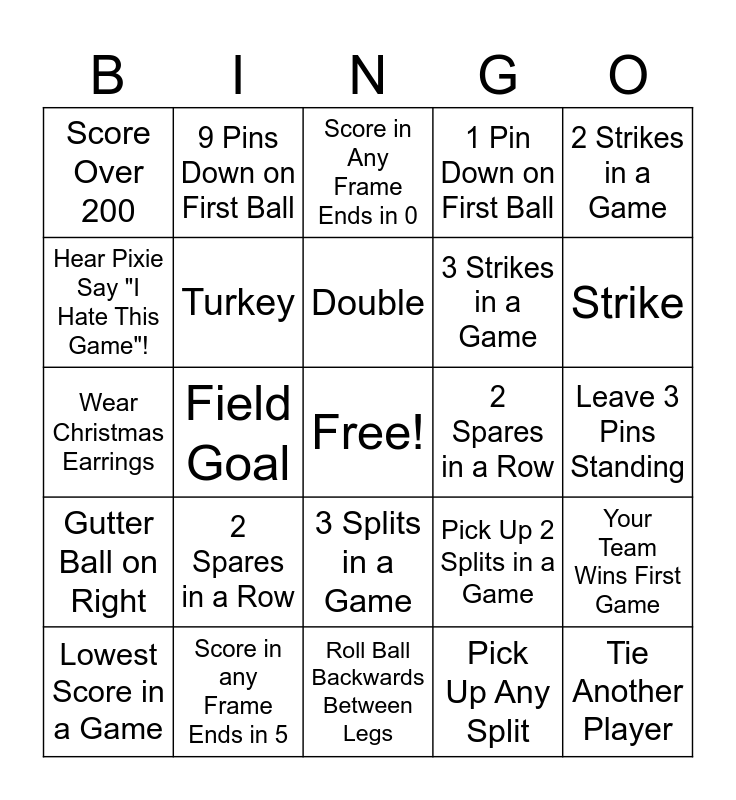 This bingo card has a free space and 24 words: 2 Spares in a Row, Score in any Frame Ends in 5, Double, Lowest Score in a Game, 2 Strikes in a Game, Score Over 200, Hear Pixie Say "I Hate This Game"!, 9 Pins Down on First Ball, 2 Spares in a Row, 3 Splits in a Game, 3 Strikes in a Game, Wear Christmas Earrings, Pick Up 2 Splits in a Game, Your Team Wins First Game, Turkey, Pick Up Any Split, Leave 3 Pins Standing, Score in Any Frame Ends in 0, Strike, Field Goal, Tie Another Player, Gutter Ball on Right, 1 Pin Down on First Ball and Roll Ball Backwards Between Legs.