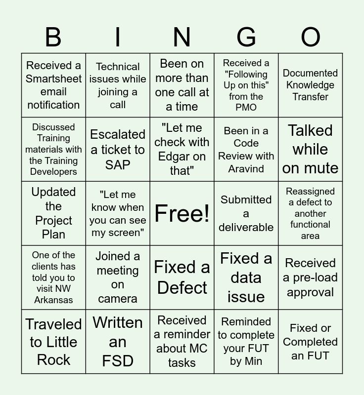 This bingo card has a free space and 29 words: Traveled to Little Rock, Attended a Defect Call, "Let me know when you can see my screen", Didn't recognize one of the songs playing prior to the Weekly Status Call, Received a Smartsheet email notification, Been on more than one call at a time, Escalated a ticket to SAP, Joined a meeting on camera, Submitted a deliverable, Written an FSD, Reassigned a defect to another functional area, Fixed or Completed an FUT, Received a reminder about MC tasks, Reminded to complete your FUT by Min, Talked while on mute, SAP GUI or Fiori App?, Fixed a Defect, One of the clients has told you to visit NW Arkansas, Documented Knowledge Transfer, Updated the Project Plan, Fixed a data issue, "Let's take this offline", Been in a Code Review with Aravind, Discussed Training materials with the Training Developers, Received a "Following Up on this" from the PMO, Technical issues while joining a call, Received a pre-load approval, "Let me check with Edgar on that" and Written a Test Script.