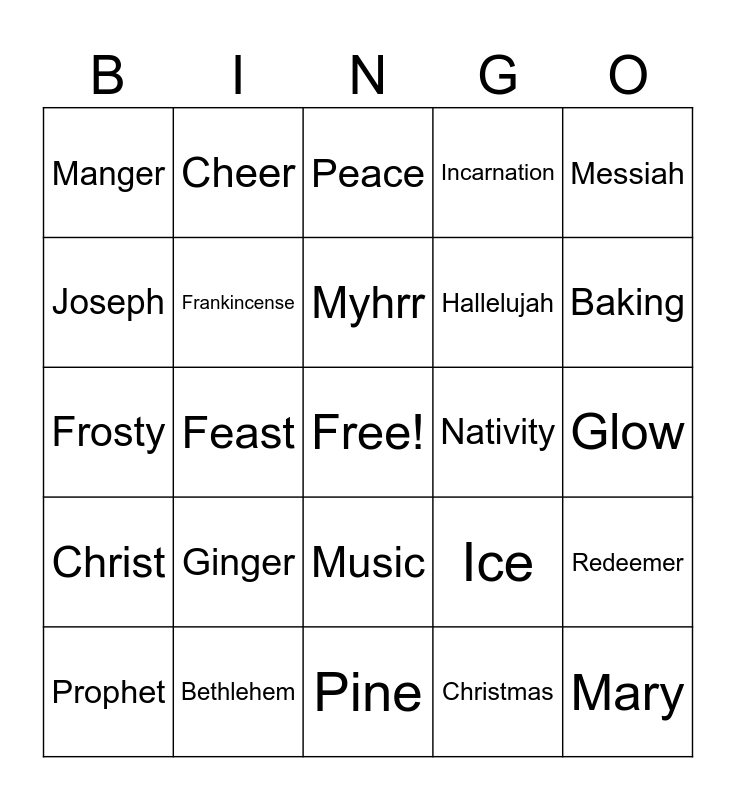 This bingo card has a free space and 60 words: Angel, Bethlehem, Candle, Christ, Christmas, Epiphany, Frankincense, Gabriel, Hallelujah, Holy, Incarnation, Jesus, Joseph, King, Magi, Manger, Mary, Messiah, Miracle, Myhrr, Nativity, Peace, Prophet, Redeemer, Savior, Shepherd, Star, Worship, Baking, Bells, Blanket, Blizzard, Candlelight, Celebration, Cheer, Chilly, Cozy, Feast, Fireplace, Frosty, Gift, Ginger, Glow, Happiness, Ice, Lantern, Laughter, Merriment, Miracle, Music, Pine, Ribbon, Scent, Scarf, Season, Snow, Snowy, Tradition, Warmth and Winter.