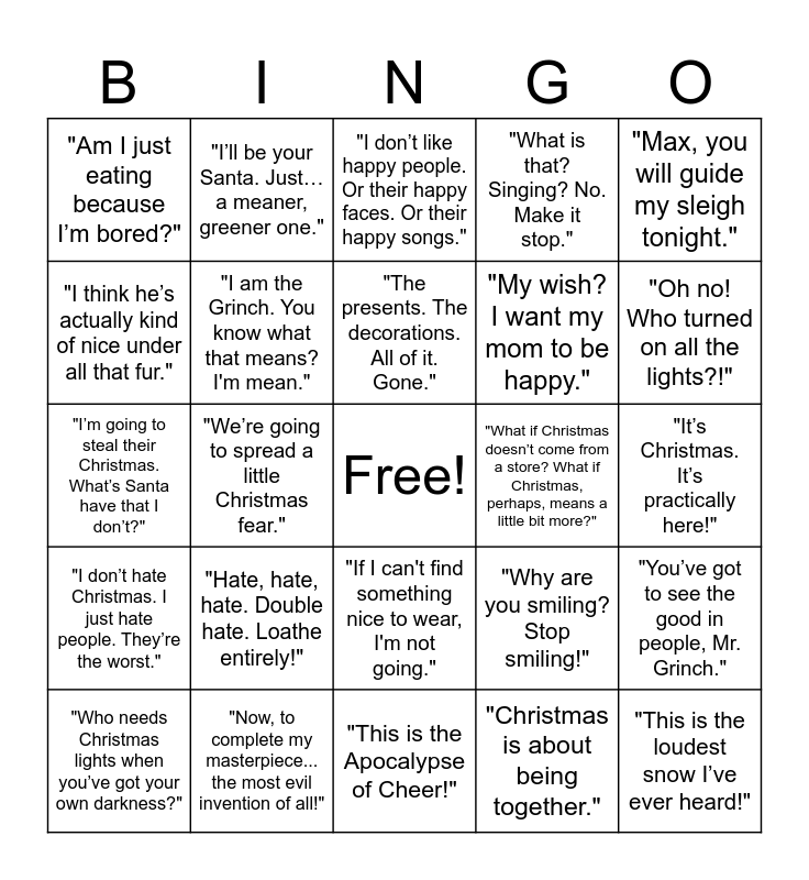 This bingo card has a free space and 40 words: "Today was great! We did mean things, and we did them in style.", "I’m going to steal their Christmas. What’s Santa have that I don’t?", "I don’t need anyone. I’m enough all by myself.", "I am the Grinch. You know what that means? I'm mean.", "Now, to complete my masterpiece... the most evil invention of all!", "If I can't find something nice to wear, I'm not going.", "The presents. The decorations. All of it. Gone.", "I’m looking for a reindeer to help me pull my sleigh. What do you say?", "Max, you will guide my sleigh tonight.", "I don’t hate Christmas. I just hate people. They’re the worst.", "We’re going to spread a little Christmas fear.", "What is that? Singing? No. Make it stop.", "This is the loudest snow I’ve ever heard!", "It’s Christmas. It’s practically here!", "What if Christmas doesn’t come from a store? What if Christmas, perhaps, means a little bit more?", "Hate, hate, hate. Double hate. Loathe entirely!", "I’ve got garlic in my soul. I’ve got onions in my heart.", "Am I just eating because I’m bored?", "It's not stealing. It's... borrowing, with style.", "I don’t like happy people. Or their happy faces. Or their happy songs.", "You’ve got to see the good in people, Mr. Grinch.", "Christmas is about being together.", "My wish? I want my mom to be happy.", "I think he’s actually kind of nice under all that fur.", "And the Grinch, with his Grinch-feet ice-cold in the snow, stood puzzling and puzzling: how could it be so?", "He hadn’t stopped Christmas from coming. It came!", "It was his heart. It grew three sizes that day.", "The Grinch was used to hating Christmas, but maybe, just maybe, he could learn to love it.", "Run for your lives! The Grinch is coming!", "Max, why is it so bright? The sun is trying to blind me!", "Look, Max! They have a giant invisible vacuum. And it’s sucking up all the joy!", "Who needs Christmas lights when you’ve got your own darkness?", "This is the worst day ever. The worst. Day. Ever!", "Why are you smiling? Stop smiling!", "Oh no! Who turned on all the lights?!", "This is the Apocalypse of Cheer!", "No one should be this happy!", "Max, fetch me my coffee… and a plan to ruin Christmas.", "I’ll be your Santa. Just… a meaner, greener one." and "I don’t care how much you love Christmas. I’m stealing it anyway.".