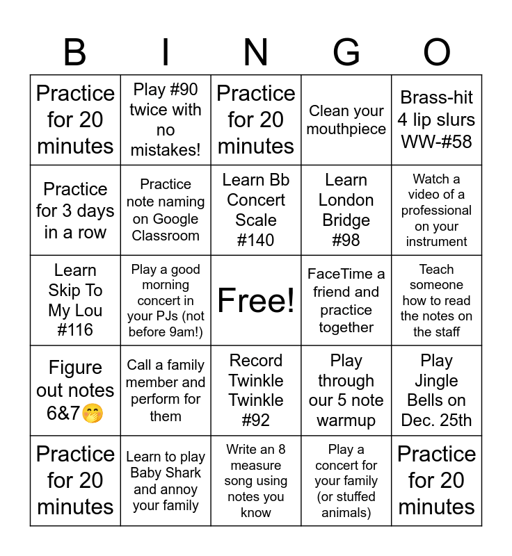 This bingo card has a free space and 24 words: Call a family member and perform for them, Learn to play Baby Shark and annoy your family, Learn Bb Concert Scale #140, Practice for 20 minutes, Brass-hit 4 lip slurs WW-#58, Practice for 20 minutes, Practice for 3 days in a row, Play #90 twice with no mistakes!, FaceTime a friend and practice together, Record Twinkle Twinkle #92, Learn London Bridge #98, Learn Skip To My Lou #116, Play through our 5 note warmup, Play Jingle Bells on Dec. 25th, Practice note naming on Google Classroom, Play a concert for your family (or stuffed animals), Teach someone how to read the notes on the staff, Practice for 20 minutes, Watch a video of a professional on your instrument, Play a good morning concert in your PJs (not before 9am!), Practice for 20 minutes, Figure out notes 6&7🤭, Clean your mouthpiece and Write an 8 measure song using notes you know.
