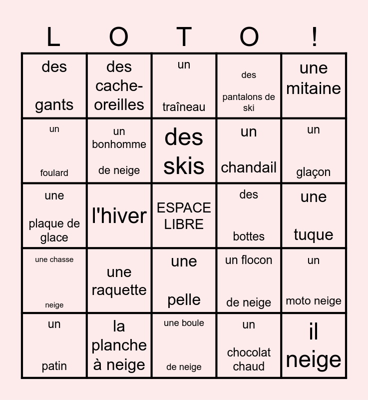 This bingo card has a free space and 24 words: une raquette, la planche à neige, des skis, un patin, une mitaine, des gants, un foulard, des cache-oreilles, des bottes, une pelle, un chandail, une plaque de glace, un flocon de neige, un moto neige, un bonhomme de neige, un chocolat chaud, une tuque, un traîneau, un glaçon, l'hiver, il neige, une chasse neige, des pantalons de ski and une boule de neige.