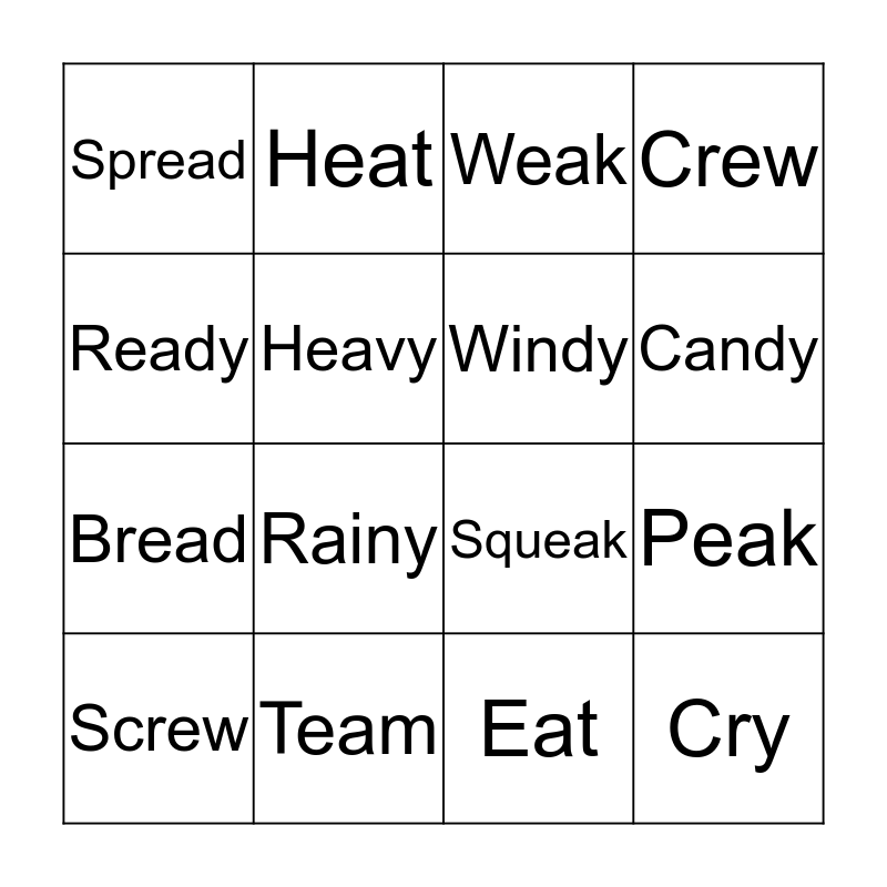 This bingo card has 16 words: Team, Peak, Weak, Spread, Bread, Heat, Squeak, Eat, Ready, Heavy, Screw, Crew, Rainy, Candy, Windy and Cry.