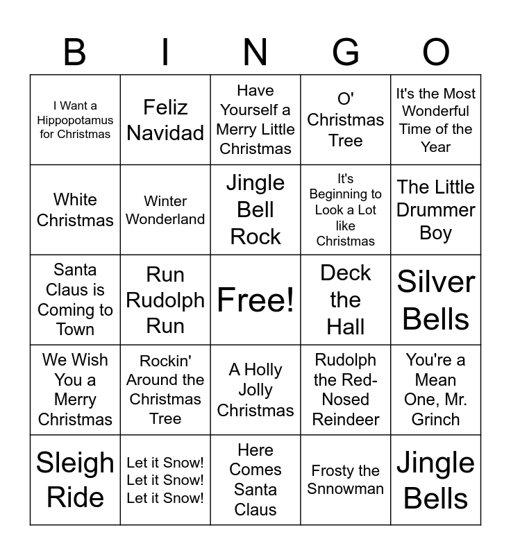 This bingo card has a free space and 24 words: Rockin' Around the Christmas Tree, Let it Snow! Let it Snow! Let it Snow!, Jingle Bell Rock, Sleigh Ride, It's the Most Wonderful Time of the Year, I Want a Hippopotamus for Christmas, White Christmas, Feliz Navidad, Deck the Hall, A Holly Jolly Christmas, It's Beginning to Look a Lot like Christmas, Santa Claus is Coming to Town, Rudolph the Red-Nosed Reindeer, You're a Mean One, Mr. Grinch, Winter Wonderland, Frosty the Snnowman, Silver Bells, Have Yourself a Merry Little Christmas, The Little Drummer Boy, Run Rudolph Run, Jingle Bells, We Wish You a Merry Christmas, O' Christmas Tree and Here Comes Santa Claus.