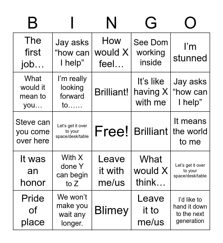 This bingo card has a free space and 29 words: Pride of place, Will can you give me a hand, Let’s get it over to your space/desk/table, The next job…, The first job…, How would X feel…, I’m really looking forward to……, With X done Y can begin to Z, Brilliant, We won’t make you wait any longer., It means the world to me, I’d like to hand it down to the next generation, Blimey, Leave it to me/us, Jay asks “how can I help”, Owner X is back to collect his/her Y, Leave it with me/us, It was an honor, I’m stunned, Steve can you come over here, What would X think…, Over the moon, It’s like having X with me, What would it mean to you…, See Dom working inside, Jay asks “how can I help”, Let’s get it over to your space/desk/table, Brilliant! and How have you done that?.