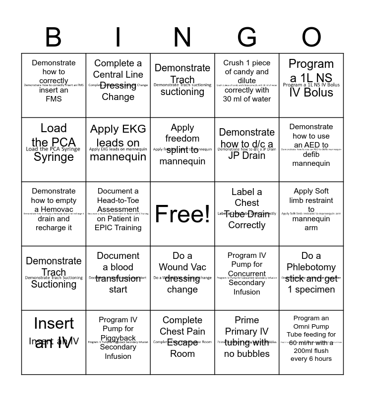 This bingo card has 30 images, a free space and 31 words: Complete Chest Pain Escape Room, Document a PCA assessment in EPIC, Document a Head-to-Toe Assessment on Patient in EPIC Training, Create a Macro in EPIC Training, Demonstrate how to correctly insert an FMS, Demonstrate Trach suctioning, Apply EKG leads on mannequin, Program IV Pump for Concurrent Secondary Infusion, Label a Chest Tube Drain Correctly, Prime Primary IV tubing with no bubbles, Apply Soft limb restraint to mannequin arm, Program an Omni Pump Tube feeding for 60 ml/hr with a 200ml flush every 6 hours, Insert an NG Tube with hinge securement on mannequin, Complete an Ostomy Dressing Change, Demonstrate how to use an AED to defib mannequin, Apply Germ Glo and Handwashing Station, Do a Phlebotomy stick and get 1 specimen, Document a blood transfusion start, Demonstrate Trach Suctioning, Do a Wound Vac dressing change, Program a 1L NS IV Bolus, Insert a Foley with a 2nd person, Insert an IV, Complete a Central Line Dressing Change, Demonstrate how to d/c a JP Drain, Load the PCA Syringe, Crush 1 piece of candy and dilute correctly with 30 ml of water, Demonstrate how to empty a Hemovac drain and recharge it, Program IV Pump for Piggyback Secondary Infusion, Apply freedom splint to mannequin and Demonstrate how to Flush a Nephrostomy Tube with 10 ml flush.