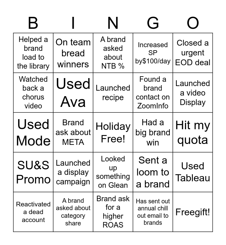 This bingo card has a free space and 39 words: Launched1:1 click match, Brand asks for retail specific data, Had a brand ghost you, Used Ava, Reactivated a dead account, Looked up something on Glean, Launched recipe, Connected with a brand on LinkedIn, Closed a urgent EOD deal, SU&S Promo, Brand ask about META, Increased SP by$100/day, Freegift!, Hit my quota, Had a big brand win, Launched a display campaign, Pitched the Ads-EcoSystem, Helped a brand load to the library, Launched 2:1 click match, Sent a loom to a brand, Watched back a chorus video, Brand ask for a higher ROAS, Found a brand contact on ZoomInfo, Launched a video Display, Got a meeting with a new brand, Sent out a email for 2026 discussion, Looked up your OKR tracking, Sent a MoM deck to a brand, Recommended a budget increase and got the full amount, On team bread winners, Excited for annual chill out, A brand reschedule the meeting during the meeting time, A brand asked about NTB %, A brand asked about category share, Has sent out annual chill out email to brands, Helped a brand navigate Ads manager, Used Tableau, Used Mode and Input a opportunity on Salesforce.
