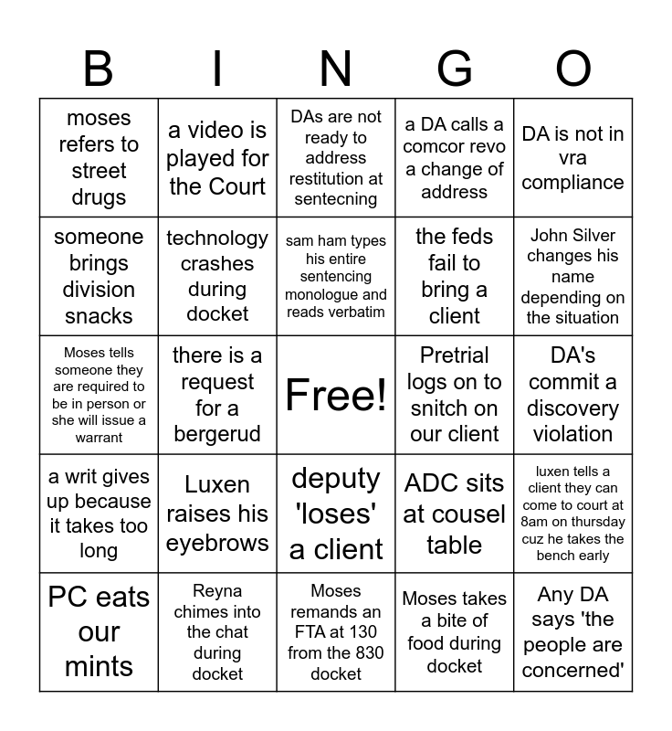 This bingo card has a free space and 34 words: Juan refers to an elusive flowchart, Moses takes a bite of food during docket, someone says they need a real attorney, someone tried to apply for the pd online and it didnt work, a writ gives up because it takes too long, technology crashes during docket, DA is not in vra compliance, PC eats our mints, a video is played for the Court, someone reek's of weed in the courtroom, sam ham types his entire sentencing monologue and reads verbatim, DAs are not ready to address restitution at sentecning, Luxen refuses to waive f/f/c, PC cuts the line, Pretrial logs on to snitch on our client, John Silver changes his name depending on the situation, Reyna chimes into the chat during docket, Moses tells someone they are required to be in person or she will issue a warrant, Luxen raises his eyebrows, ADC sits at cousel table, deputy 'loses' a client, luxen respectfully denies to modify bond, moses refers to street drugs, DA's commit a discovery violation, Moses remands an FTA at 130 from the 830 docket, Any DA says 'the people are concerned', a DA calls a comcor revo a change of address, someone falls asleep in the gallery, the feds fail to bring a client, someone brings division snacks, sean has coffee in a mustard container, there is a request for a bergerud, luxen tells a client they can come to court at 8am on thursday cuz he takes the bench early and there is an error in the uploaded ppwk.