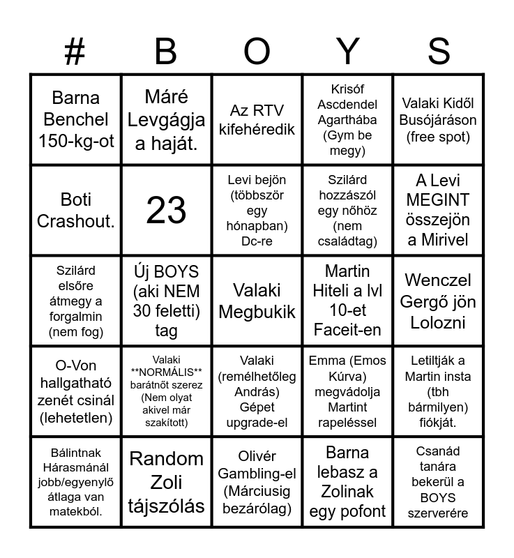 This bingo card has 25 words: Valaki **NORMÁLIS** barátnőt szerez (Nem olyat akivel már szakított), Olivér Gambling-el (Márciusig bezárólag), Levi bejön (többször egy hónapban) Dc-re, Bálintnak Hárasmánál jobb/egyenylő átlaga van matekból., Valaki Kidől Busójáráson (free spot), Barna Benchel 150-kg-ot, Boti Crashout., Máré Levgágja a haját., Martin Hiteli a lvl 10-et Faceit-en, Valaki (remélhetőleg András) Gépet upgrade-el, Szilárd hozzászól egy nőhöz (nem családtag), Szilárd elsőre átmegy a forgalmin (nem fog), Emma (Emos Kúrva) megvádolja Martint rapeléssel, Letiltják a Martin insta (tbh bármilyen) fiókját., 23, Csanád tanára bekerül a BOYS szerverére, Wenczel Gergő jön Lolozni, Az RTV kifehéredik, A Levi MEGINT összejön a Mirivel, Új BOYS (aki NEM 30 feletti) tag, Valaki Megbukik, Random Zoli tájszólás, O-Von hallgatható zenét csinál (lehetetlen), Krisóf Ascdendel Agarthába (Gym be megy) and Barna lebasz a Zolinak egy pofont.