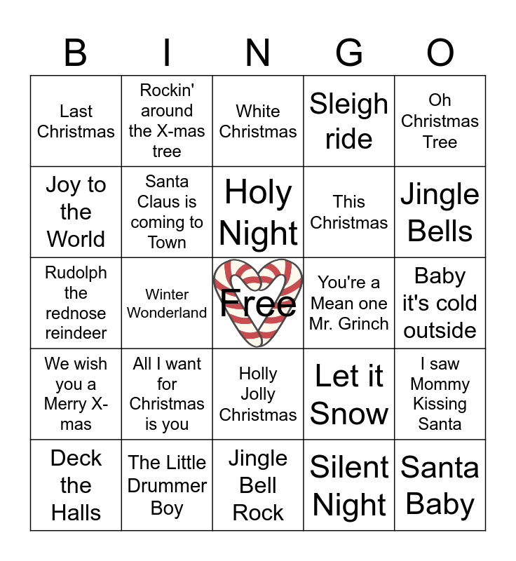 This bingo card has a free space and 25 words: Deck the Halls, All I want for Christmas is you, Holy Night, Silent Night, Jingle Bells, Last Christmas, Rockin' around the X-mas tree, White Christmas, This Christmas, I saw Mommy Kissing Santa, Rudolph the rednose reindeer, Santa Claus is coming to Town, Let it Snow, Santa Baby, Joy to the World, The Little Drummer Boy, Jingle Bell Rock, Sleigh ride, Baby it's cold outside, We wish you a Merry X-mas, Winter Wonderland, Holly Jolly Christmas, You're a Mean one Mr. Grinch, Oh Christmas Tree and Have yourself a Merry Little X-mas.