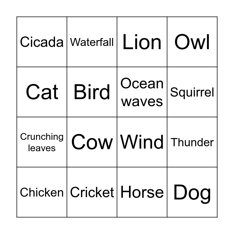 This bingo card has 16 words: Cricket, Thunder, Lion, Cicada, Crunching leaves, Waterfall, Wind, Horse, Cat, Bird, Chicken, Owl, Cow, Squirrel, Ocean waves and Dog.