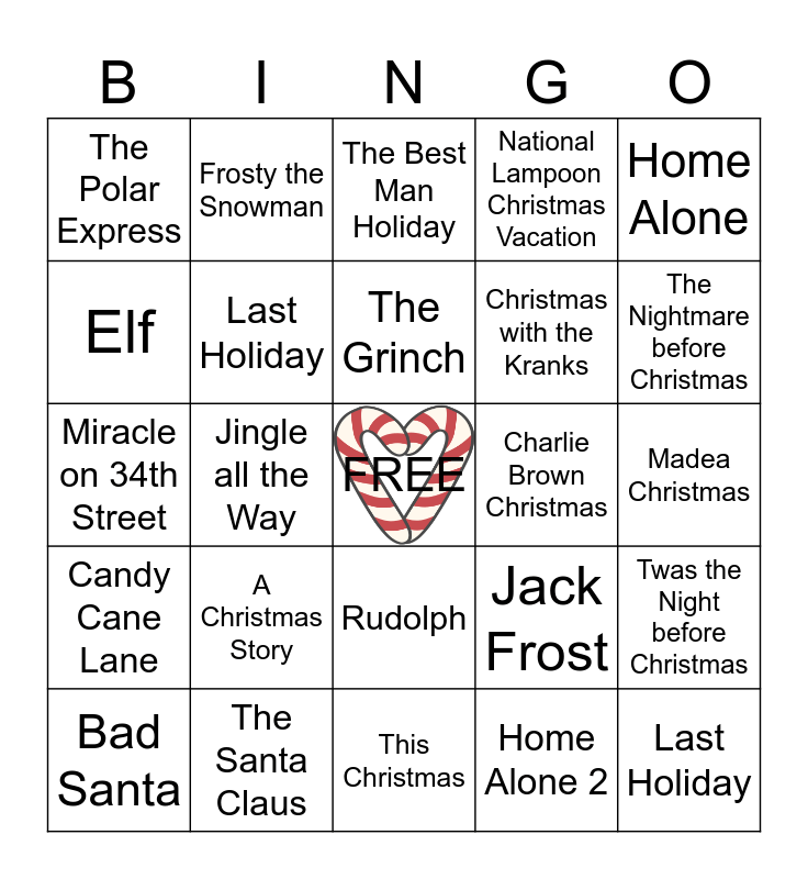 This bingo card has a free space and 25 words: A Christmas Story, This Christmas, The Grinch, Bad Santa, Home Alone, The Polar Express, Elf, Frosty the Snowman, Charlie Brown Christmas, Rudolph, Christmas with the Kranks, Miracle on 34th Street, Jack Frost, Twas the Night before Christmas, Last Holiday, Deck the Halls, Madea Christmas, The Best Man Holiday, The Nightmare before Christmas, Jingle all the Way, Last Holiday, The Santa Claus, Candy Cane Lane, National Lampoon Christmas Vacation and Home Alone 2.