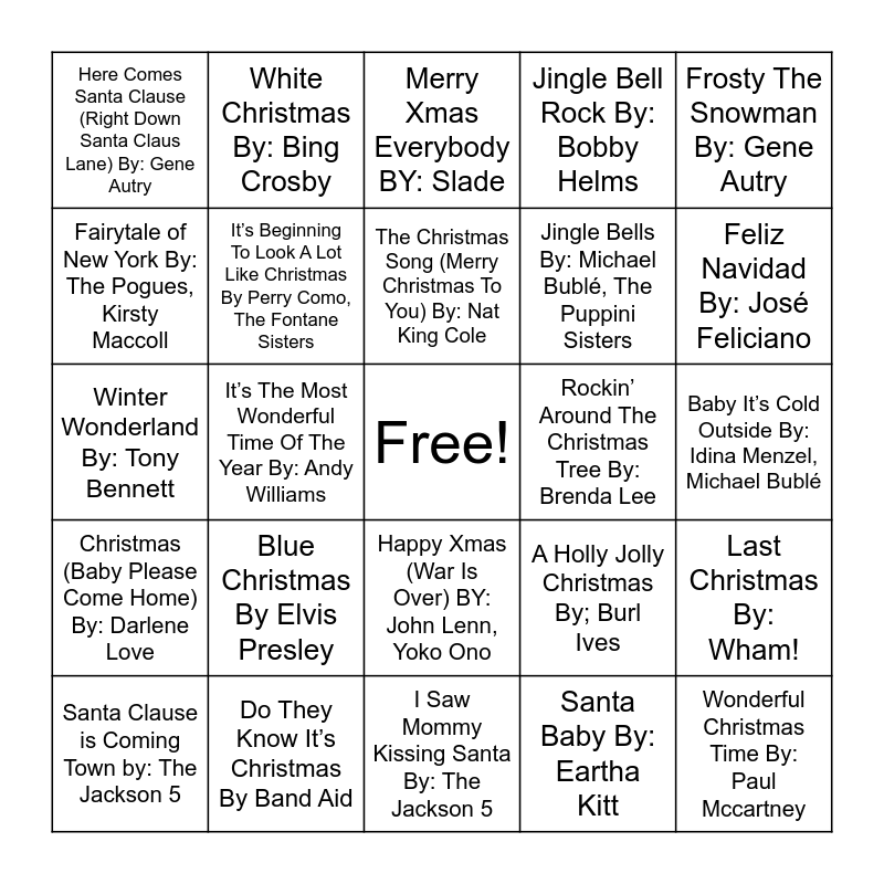 This bingo card has a free space and 29 words: Santa Clause is Coming Town by: The Jackson 5, Sleigh Ride By: The Ronettes, It’s The Most Wonderful Time Of The Year By: Andy Williams, Riving Home For Christmas By Chris Rea, Here Comes Santa Clause (Right Down Santa Claus Lane) By: Gene Autry, Merry Xmas Everybody BY: Slade, It’s Beginning To Look A Lot Like Christmas By Perry Como, The Fontane Sisters, Blue Christmas By Elvis Presley, Rockin’ Around The Christmas Tree By: Brenda Lee, Do They Know It’s Christmas By Band Aid, Baby It’s Cold Outside By: Idina Menzel, Michael Bublé, Wonderful Christmas Time By: Paul Mccartney, I Saw Mommy Kissing Santa By: The Jackson 5, Santa Baby By: Eartha Kitt, Feliz Navidad By: José Feliciano, Let It Snow! Let It Snow! Let It Snow! By: Dean Martin, Happy Xmas (War Is Over) BY: John Lenn, Yoko Ono, Christmas (Baby Please Come Home) By: Darlene Love, Frosty The Snowman By: Gene Autry, Winter Wonderland By: Tony Bennett, A Holly Jolly Christmas By; Burl Ives, All I Want For Christmas Is You By: Mariah Carey, Jingle Bells By: Michael Bublé, The Puppini Sisters, Fairytale of New York By: The Pogues, Kirsty Maccoll, Jingle Bell Rock By: Bobby Helms, White Christmas By: Bing Crosby, Last Christmas By: Wham!, The Christmas Song (Merry Christmas To You) By: Nat King Cole and Have Yourself a Merry Little Christmas By: Frank Sinatra.