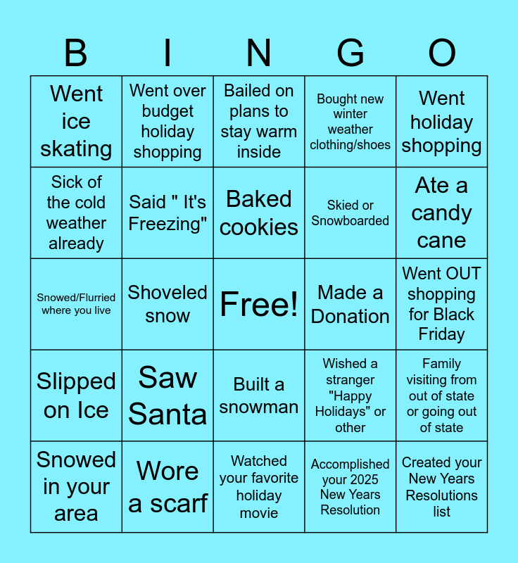 This bingo card has a free space and 26 words: Built a snowman, Accomplished your 2025 New Years Resolution, Baked cookies, Wore a scarf, Went holiday shopping, Went ice skating, Sick of the cold weather already, Went over budget holiday shopping, Went OUT shopping for Black Friday, Wished a stranger "Happy Holidays" or other, Skied or Snowboarded, Snowed/Flurried where you live, Family visiting from out of state or going out of state, Snowed in your area, Shoveled snow, Drank hot chocolate, Bought new winter weather clothing/shoes, Slipped on Ice, Bailed on plans to stay warm inside, Created your New Years Resolutions list, Ate a candy cane, Watched your favorite holiday movie, Made a Donation, Saw Santa, Said " It's Freezing" and Received a snowstorm warning.