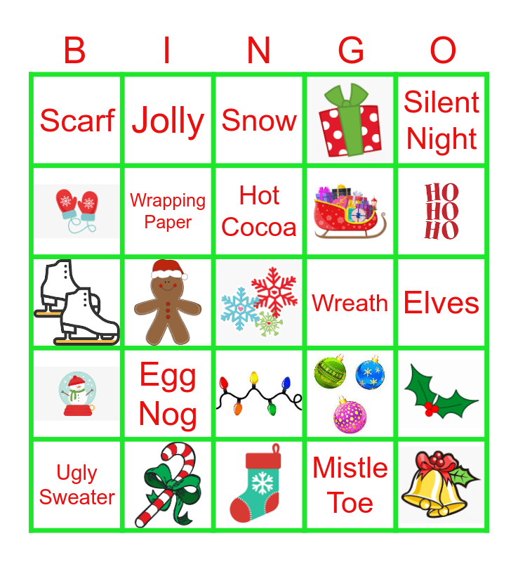 This bingo card has 13 images, a free space and 11 words: Ugly Sweater, Egg Nog, Hot Cocoa, Mistle Toe, Silent Night, Scarf, Jolly, Snow, Wreath, Elves and Wrapping Paper.
