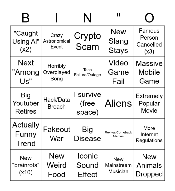 This bingo card has a free space and 24 words: Fakeout War, New Weird Food, Tech Failure/Outage, New "brainrots" (x10), Famous Person Cancelled (x3), "Caught Using Ai" (x2), Next "Among Us", Crazy Astronomical Event, Aliens, Big Disease, Video Game Fail, Big Youtuber Retires, Revival/Comeback Memes, More Internet Regulations, Horribly Overplayed Song, New Mainstream Musician, Extremely Popular Movie, Crypto Scam, Massive Mobile Game, Hack/Data Breach, New Animals Dropped, Actually Funny Trend, New Slang Stays and Iconic Sound Effect.