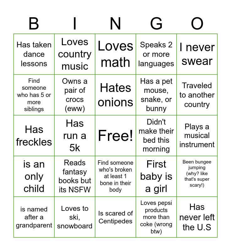 This bingo card has a free space and 24 words: Reads fantasy books but its NSFW, Loves to ski, snowboard, Hates onions, is named after a grandparent, I never swear, Has taken dance lessons, Find someone who has 5 or more siblings, Loves country music, Didn't make their bed this morning, Find someone who's broken at least 1 bone in their body, Has a pet mouse, snake, or bunny, Has freckles, First baby is a girl, Been bungee jumping (why? like that's super scary!), Owns a pair of crocs (eww), Loves pepsi products more than coke (wrong btw), Plays a musical instrument, Loves math, Traveled to another country, Has run a 5k, Has never left the U.S, is an only child, Speaks 2 or more languages and Is scared of Centipedes.