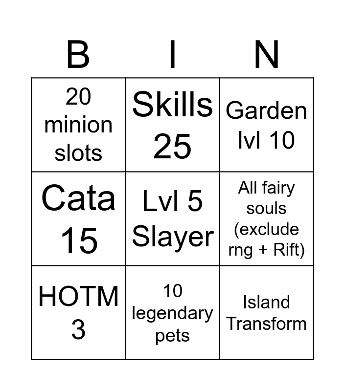 This bingo card has 9 words: HOTM 3, Garden lvl 10, Skills 25, Cata 15, 20 minion slots, All fairy souls (exclude rng + Rift), Lvl 5 Slayer, Island Transform and 10 legendary pets.