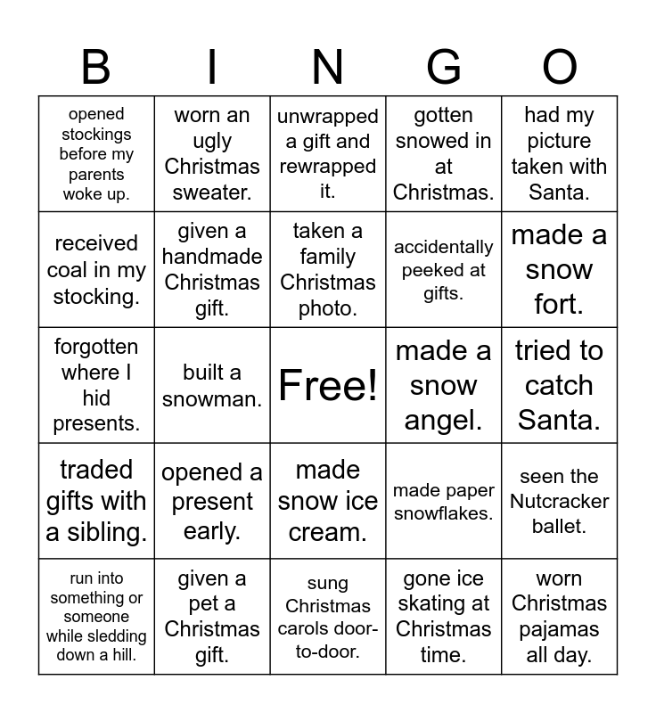 This bingo card has a free space and 51 words: peeked at presents before Christmas., worn Christmas pajamas all day., made a gingerbread house that fell apart., sung Christmas carols door-to-door., opened a present early., watched the same Christmas movie more than once on the same day., worn an ugly Christmas sweater., stayed up all night waiting for Santa., received coal in my stocking., broken a Christmas ornament., given a handmade Christmas gift., gotten snowed in at Christmas., seen the Nutcracker ballet., made paper snowflakes., worn a Santa hat to school or work., gone sledding on Christmas break., taken a family Christmas photo., made a snow angel., written a letter to Santa., had my picture taken with Santa., built a snowman., gone ice skating at Christmas time., opened stockings before my parents woke up., accidentally peeked at gifts., helped decorate the house with Christmas lights., gone shopping in pajamas., made a snow fort., used a glue gun on a gingerbread house., run into something or someone while sledding down a hill., unwrapped a gift and rewrapped it., gotten caught snooping for gifts., accidentally told someone their gift before Christmas., eaten frosting straight from the tube., worn matching Christmas pajamas., decorated my room with lights., given a pet a Christmas gift., accidentally broken a new toy on Christmas Day., touched my Elf on the Shelf., run outside barefoot in the snow., decorated the tree with popcorn., tried to catch Santa., traded gifts with a sibling., worn Christmas socks in July., accidentally knocked the Christmas tree over., eaten Santaโs cookies before Christmas morning., played Christmas music before Thanksgiving., forgotten where I hid presents., made a Christmas ornament at school., been in a Christmas play., made snow ice cream. and gotten up before 5 a.m. on Christmas..