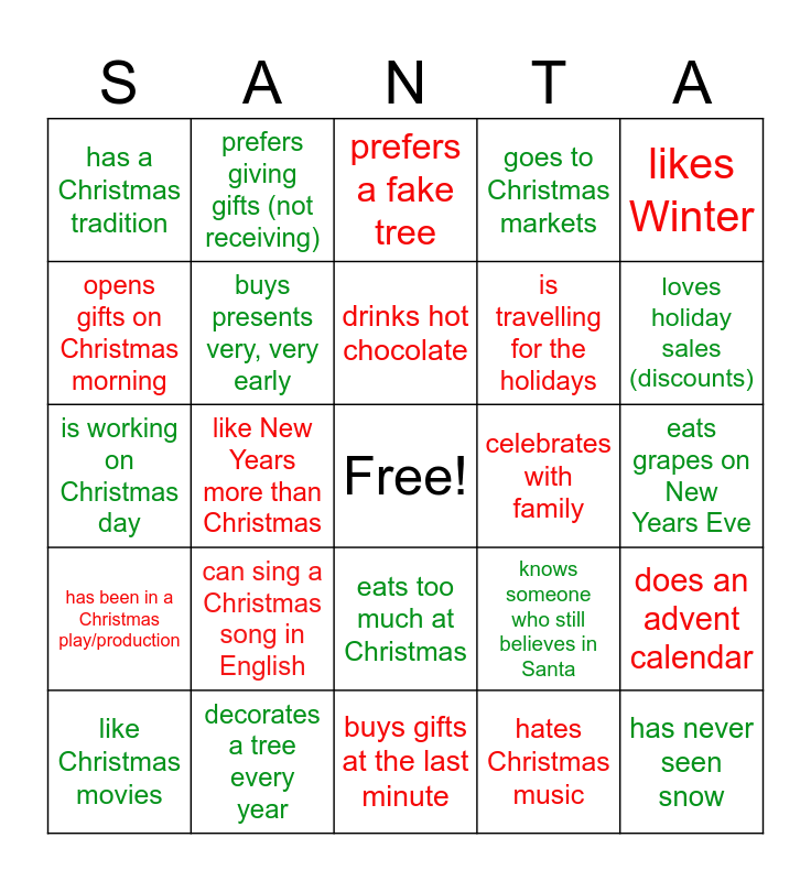 This bingo card has a free space and 24 words: can sing a Christmas song in English, decorates a tree every year, drinks hot chocolate, like Christmas movies, likes Winter, has a Christmas tradition, opens gifts on Christmas morning, prefers giving gifts (not receiving), celebrates with family, eats too much at Christmas, is travelling for the holidays, is working on Christmas day, knows someone who still believes in Santa, does an advent calendar, buys presents very, very early, hates Christmas music, eats grapes on New Years Eve, prefers a fake tree, loves holiday sales (discounts), like New Years more than Christmas, has never seen snow, has been in a Christmas play/production, goes to Christmas markets and buys gifts at the last minute.