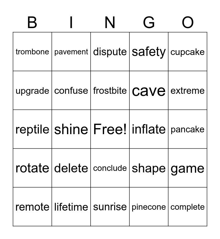 This bingo card has a free space and 24 words: delete, lifetime, frostbite, remote, cupcake, trombone, upgrade, pavement, inflate, conclude, cave, reptile, shape, game, confuse, pinecone, pancake, dispute, extreme, shine, complete, rotate, safety and sunrise.