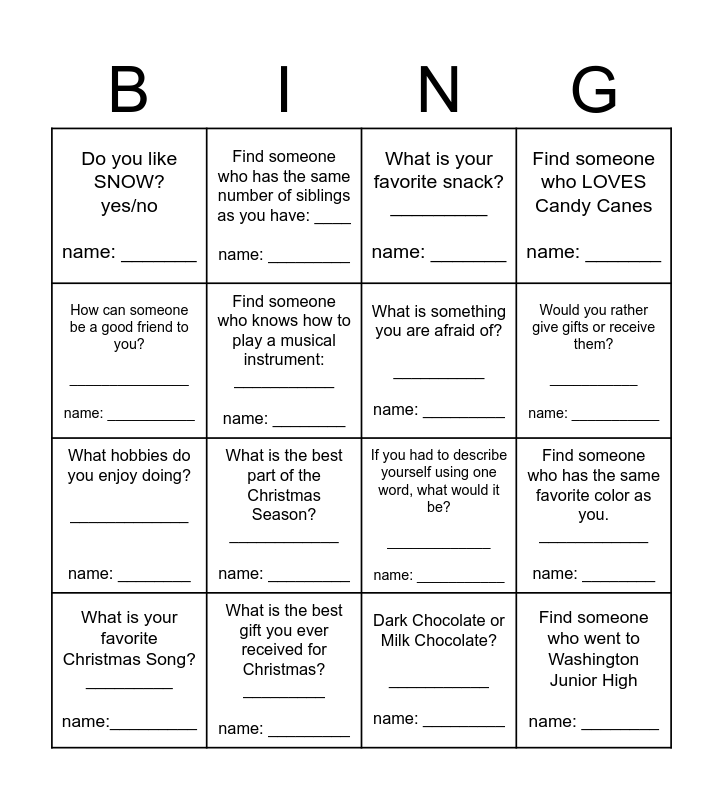 This bingo card has 20 words: Find someone who has the same favorite color as you. ____________ name: ________, What was your favorite Subject in School? _____________ name:__________, What is your favorite snack? _________ name: _______, What is something you are really good at? ____________ name: _________, What is your favorite Christmas Song? _________ name:_________, How can someone be a good friend to you? _______________ name: ___________, What is the best gift you ever received for Christmas? _________ name: _________, Do you like SNOW? yes/no name: _______, What hobbies do you enjoy doing? _____________ name: ________, Find someone who has the same number of siblings as you have: ____ name: _________, What is the best part of the Christmas Season? ____________ name: _________, If you had to describe yourself using one word, what would it be? _____________ name: ___________, Find someone who knows how to play a musical instrument: ___________ name: ________, Find someone who went to Washington Junior High name: ________, What is something you are afraid of? __________ name: _________, What is your favorite board or card game? _____________ name: _________, Would you rather give gifts or receive them? ___________ name: ___________, Find someone who LOVES Candy Canes name: _______, Dark Chocolate or Milk Chocolate? ___________ name: _________ and What's the best part of your day? __________ name: _________.