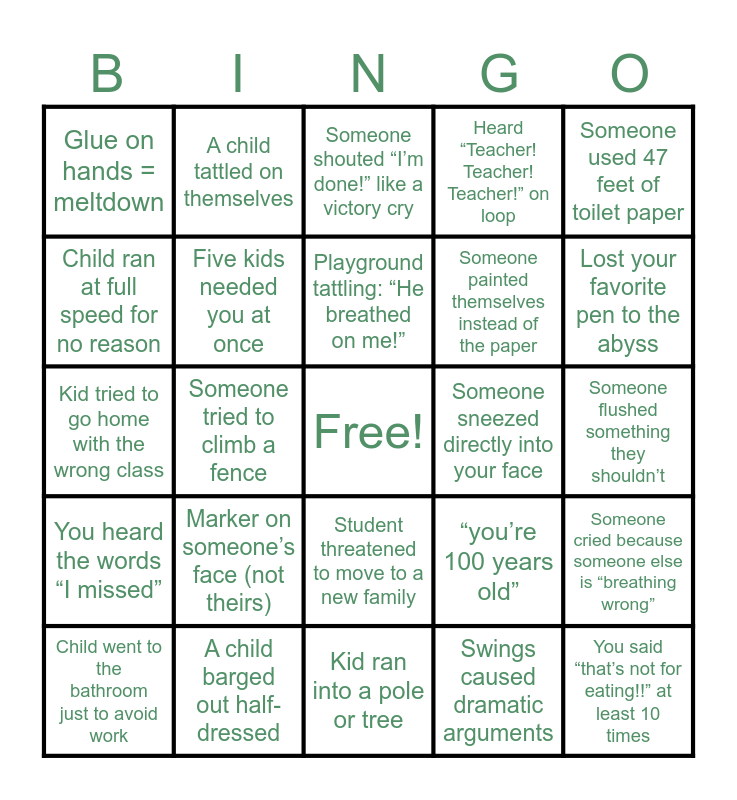 This bingo card has a free space and 120 words: Drank your coffee cold, Ate lunch after 2:00 PM, Stepped on a LEGO or tiny toy, You pretended not to see something because you were exhausted, Said “walking feet” more than 20 times, Forgot where you put something in your own hand, Heard “Teacher! Teacher! Teacher!” on loop, Survived the day using sheer willpower, Someone cried because someone else is “breathing wrong”, You mediated a friendship breakup and makeup within 2 minutes, A child needed you to blow a kiss to their tiny invisible “injury”, Someone got offended you didn’t sit at their table, Child needed a hug at the exact wrong time, A child told you they’re never coming back (they do), Someone yelled “YOU’RE NOT MY BOSS”, Kid melted down over the wrong color cup, Student threatened to move to a new family, A child announced “I peed a little” (it wasn’t a little), Someone flushed something they shouldn’t, Kid locked themselves in the bathroom stall, Child went to the bathroom just to avoid work, Someone shouted “I’m done!” like a victory cry, Accident that required a full wardrobe change, A student forgot to pull their pants down… or up, Someone used 47 feet of toilet paper, You heard the words “I missed”, A child barged out half-dressed, Kid face-planted then said “I’m fine!”, Someone cried because someone else “looked at them”, A kid threw a soccer ball straight up and regretted it, Swings caused dramatic arguments, Someone tried to climb a fence, Playground tattling: “He breathed on me!”, Kid ran into a pole or tree, Someone lost a shoe and didn’t know how, You caught spit in mid-air, Mystery wet spot, Someone sneezed directly into your face, A kid used your pants as a tissue, Found something sticky on you and you just accepted it, Child asked you to smell their finger (you did NOT), Kid coughed with the drama of a Victorian ghost, Told a child “please don’t lick me”, A student wiped their nose on your shirt, A child proudly handed you a booger, You caught spit in mid-air, Mystery wet spot on your sleeve, Someone sneezed directly into your face, A kid used your pants as a tissue, Found something sticky on you and you just accepted it, Child asked you to smell their finger (you did NOT), Kid coughed with the drama of a Victorian ghost, “you’re 100 years old”, “You look like my grandma”, “I can’t learn today, my legs are broken”, “I don’t speak English anymore” (they do), “I didn’t do it” (while literally doing it), “I can’t hear you when I’m sad”, “I’m not tired” falls asleep immediately, A child tattled on themselves, Someone cried because their paper was “too papery”, A kid said something so personal you couldn’t unhear it, Child crawled under a table and refused to come out, Someone tried to escape the classroom, A kid climbed furniture like it was a mountain, Child ran at full speed for no reason, Two students fought over a single broken crayon, Breakup drama: “You’re not my best friend anymore!”, A student dramatically collapsed on the floor, Someone screamed because their sock “felt weird”, Kid tried to go home with the wrong class, You broke up a fight over who gets to push the button on the wall, Child ate a crayon (or tried to), Kid licked a glue stick, Glitter explosion — somehow everywhere, Student used scissors on their own hair, Someone painted themselves instead of the paper, Play-Doh stuck to your shoe, You said “that’s not for eating!!” at least 10 times, Marker on someone’s face (not theirs), Glue on hands = meltdown, Child stuck a sticker to their tongue, Kid face-planted then said “I’m fine!”, Someone cried because someone else “looked at them”, Swings caused dramatic arguments, Tattling: “He breathed on me!”, Kid ran into a pole or tree, Someone lost a shoe and didn’t know how, A child laid down on the cold floor “because it feels nice”, You chased a runaway coat sleeve for five minutes, A child announced “I peed a little” (it wasn’t a little), Someone flushed something they shouldn’t, Kid locked themselves in the bathroom stall, Child went to the bathroom just to avoid work, Someone shouted “I’m done!” like a victory cry, Accident that required a full wardrobe change, A student forgot to pull their pants down… or up, Someone used 47 feet of toilet paper, You heard the words “I missed”, A child barged out half-dressed, Someone cried because someone else is “breathing wrong”, You mediated a friendship breakup and makeup within 2 minutes, A child needed you to blow on their tiny invisible “injury”, Someone got offended you didn’t sit at their table, Child needed a hug at the exact wrong time, Five kids needed you at once, A child told you they’re never coming back (they do), Someone yelled “YOU’RE NOT MY BOSS”, Kid melted down over the wrong color cup, Student threatened to move to a new family, Called a student by your own child’s name, Drank your coffee cold (again), Ate lunch after 2:00 PM, Stepped on a LEGO or tiny toy, Lost your favorite pen to the abyss, You pretended not to see something because you were exhausted, Said “walking feet” more than 20 times, Forgot where you put something in your own hand, Heard “Teacher! Teacher! Teacher!” on loop and Survived the day using sheer willpower.