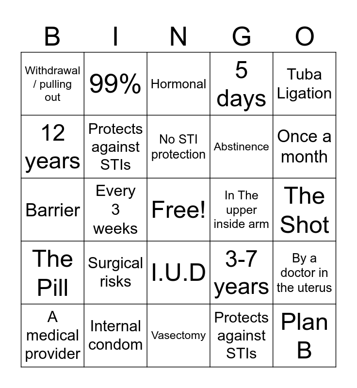 This bingo card has a free space and 24 words: Surgical risks, Internal condom, No STI protection, A medical provider, Tuba Ligation, Withdrawal / pulling out, 12 years, 99%, In The upper inside arm, I.U.D, Abstinence, Barrier, 3-7 years, By a doctor in the uterus, Protects against STIs, Protects against STIs, The Shot, Hormonal, Once a month, Every 3 weeks, Plan B, The Pill, 5 days and Vasectomy.