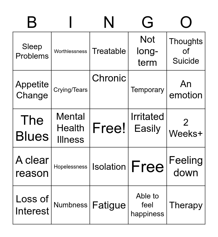 This bingo card has a free space and 25 words: Hopelessness, Fatigue, Chronic, Loss of Interest, Thoughts of Suicide, Sleep Problems, Appetite Change, Worthlessness, Irritated Easily, Isolation, Temporary, The Blues, Free, Feeling down, Crying/Tears, Doesn't affect Normal life, 2 Weeks+, Treatable, An emotion, Mental Health Illness, Therapy, Numbness, A clear reason, Not long-term and Able to feel happiness.