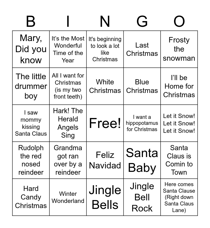 This bingo card has a free space and 29 words: Hard Candy Christmas, Do you hear what I hear, Hark! The Herald Angels Sing, Silver Bells, Mary, Did you know, It's beginning to look a lot like Christmas, All I want for Christmas (is my two front teeth), Grandma got ran over by a reindeer, I want a hippopotamus for Christmas, Winter Wonderland, Let it Snow! Let it Snow! Let it Snow!, Here comes Santa Clause (Right down Santa Claus Lane), Jingle Bells, Jingle Bell Rock, I’ll be Home for Christmas, All I want for Christmas is you, Feliz Navidad, Rudolph the red nosed reindeer, Frosty the snowman, I saw mommy kissing Santa Claus, Santa Baby, Baby its cold outside, Blue Christmas, The little drummer boy, Last Christmas, It’s the Most Wonderful Time of the Year, Santa Claus is Comin to Town, White Christmas and It’s beginning to look a lot like Christmas.