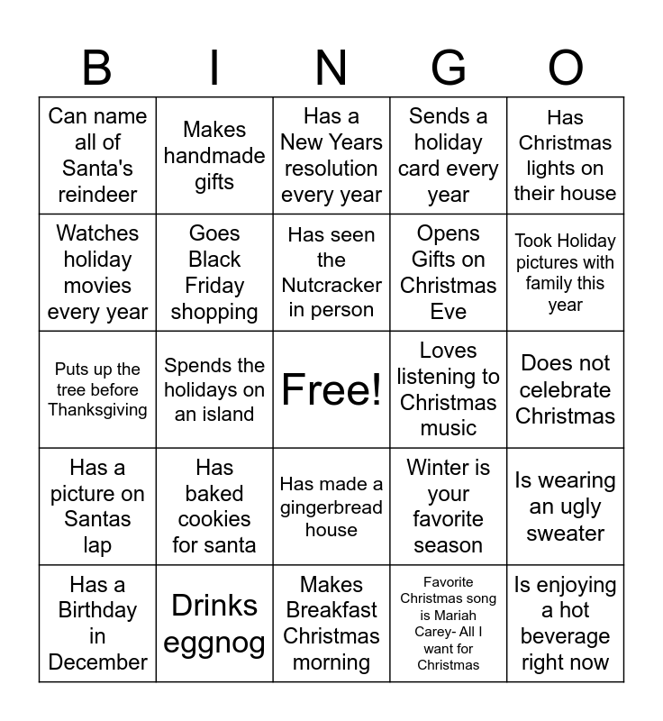 This bingo card has a free space and 24 words: Has baked cookies for santa, Drinks eggnog, Has seen the Nutcracker in person, Has a Birthday in December, Has Christmas lights on their house, Can name all of Santa's reindeer, Watches holiday movies every year, Makes handmade gifts, Loves listening to Christmas music, Has made a gingerbread house, Opens Gifts on Christmas Eve, Puts up the tree before Thanksgiving, Winter is your favorite season, Is wearing an ugly sweater, Goes Black Friday shopping, Favorite Christmas song is Mariah Carey- All I want for Christmas, Does not celebrate Christmas, Has a New Years resolution every year, Took Holiday pictures with family this year, Spends the holidays on an island, Is enjoying a hot beverage right now, Has a picture on Santas lap, Sends a holiday card every year and Makes Breakfast Christmas morning.