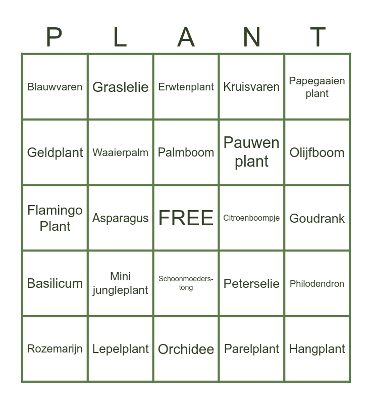 This bingo card has a free space and 89 words: Monstera, Pannenkoeken Plant, Schoonmoeders-tong, Rubberplant, Gebedsplant, Olifantsoor, Paradijsvogel Plant, Goudpalm, Kamerpalm, Vingerplant, Drakenbloed- Boom, Geluksplant, Philodendron, Goudrank, Zilverrank, Palmboom, Cactus, Vetplant, Aloë, Zebraplant, Dwergpeper, Bladbegonia, Orchidee, Ananasplant, Flamingo Plant, Lepelplant, Aralia, Geldboom, Koffieplant, Bananen Plant, Kruisvaren, Asparagus, Mini varen, Blauwvaren, Hartjesplant, Erwtenplant, Geldplant, Dwergpalm, Olijfboom, Rozemarijn, Basilicum, Munt, Lavendel, Tijm, Peterselie, Citroenboompje, Vijgenboom, Eucalyptus, Klimop, Graslelie, Kamerden, Bonsai, Luchtplantje, Koraalcactus, Rattenstaart Cactus, Zwaardcactus, Slangenplant, Kattenstaart Plant, Vleesetende plant, Venusvliegenval, Bekerplant, Slaapplant, Goudvisplant, Lippenstift Plant, Polkadot Plant, Schildpad Plant, Discoplant, Kwartjesplant, Pannenkoek Plant, Mini jungleplant, Hangplant, Kaasplant, Vioolblad plant, Pauwen plant, Waaierpalm, Parelplant, Hanging hearts, Koraalplant, Zilverblad, Zenuwplant, Papegaaien plant, Dwergbamboe, Vetkruid, Vrouwenhaar varen, Palmlelie, Monstera, Monstera, Monstera and Monstera.