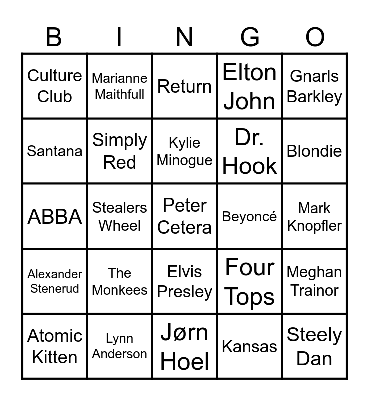 This bingo card has 25 words: The Monkees, Jørn Hoel, Kylie Minogue, Atomic Kitten, Gnarls Barkley, Culture Club, Santana, Marianne Maithfull, Beyoncé, Elvis Presley, Dr. Hook, ABBA, Four Tops, Meghan Trainor, Simply Red, Steely Dan, Mark Knopfler, Return, Blondie, Stealers Wheel, Peter Cetera, Lynn Anderson, Alexander Stenerud, Elton John and Kansas.
