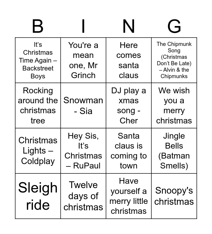 This bingo card has 53 words: Free!, Sleigh ride, Feliz navidad, All i want for christmas is you, Joy to the world, O christmas tree, You're a mean one, Mr Grinch, The Little Drummer Boy – Harry Simeone Chorale, Snowman - Sia, O Tannenbaum, DJ play a xmas song - Cher, I was mommy kissing santa claus, Thank god it's christmas - Queen, Xmas - kylie minogue, Deck the halls, Jingle bells, We wish you a merry christmas, Twelve days of christmas, White christmas, Rocking around the christmas tree, Jingle Bells (Batman Smells), Cozy Little Christmas – Katy Perry, Christmas Lights – Coldplay, It’s Christmas Time Again – Backstreet Boys, 8 days of christmas – Destiny’s Child, Santa Baby - eartha kit, All I Want for Christmas Is My Two Front Teeth – Spike Jones, Away in a manger, Run run rudolph, Hey Sis, It’s Christmas – RuPaul, LAst christmas, It's beginning to look a lot like christmas, Let it snow let it snow let it snow, Mistletoe - Justin Bieber, Underneath the tree, Grandma got run over by a reindeer, The Chipmunk Song (Christmas Don’t Be Late) – Alvin & the Chipmunks, Christmas Tree Farm – Taylor Swift, Here comes santa claus, Silent Night, Santa tell em, Hark! The herald angels sing, Have yourself a merry little christmas, Jingle bell rock, Silver bells, Rudolph the rednosed reindeer, I'll be home for christmas, Frosty the snowman, Santa claus is coming to town, Snoopy's christmas, Holly jolly xmas, Do they know it's christmas and Like It’s Christmas – Jonas Brothers.