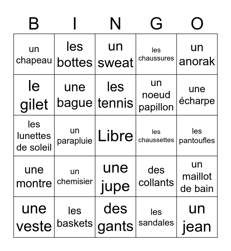 This bingo card has a free space and 45 words: les vêtements, un jean, une casquette, une veste, un pantalon, les sandales, un sweat, un manteau, un anorak, les baskets, les chaussures, les chaussettes, une jupe, un chemisier, une robe, des gants, la taille, les lunettes de soleil, une ceinture, une écharpe, les bottes, une chemise, un pull, un chapeau, un pyjama, les pantoufles, un sac à main, les bas, des collants, une montre, un complet/un costume, un maillot de bain, un bracelet, un débardeur, les sous-vêtements, un parapluie, un casquette, un collier, un jogging, les tennis, le gilet, un noeud papillon, un sweat à capuche, une bague and des boucles d'oreilles.