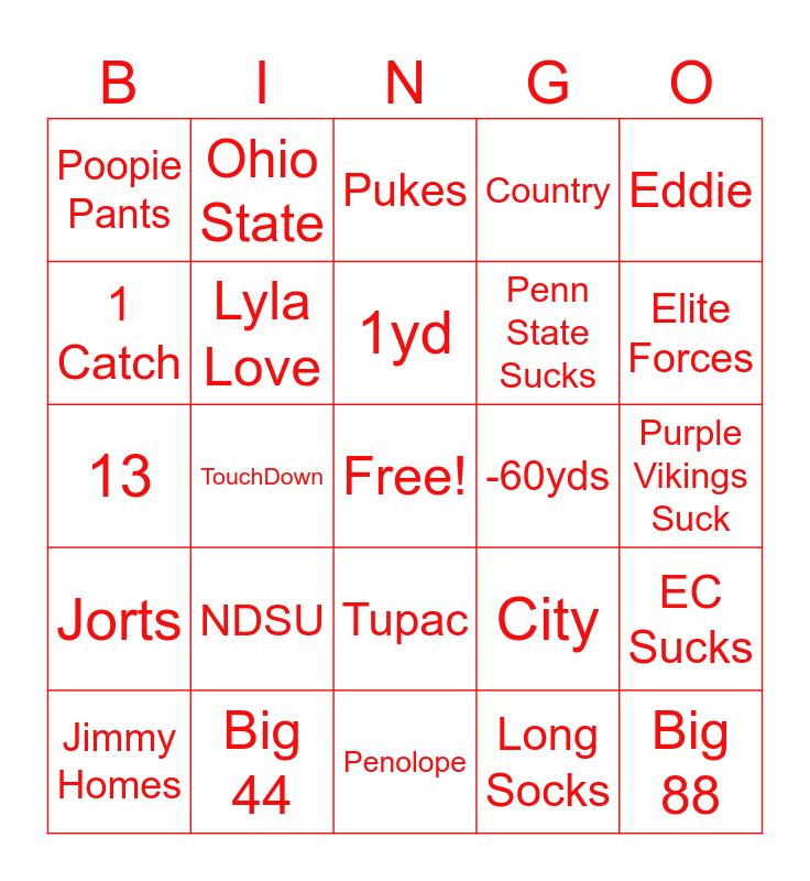 This bingo card has a free space and 29 words: Jimmy Homes, Bonzi, TouchDown, Showers, Poopie Pants, Pukes, Lyla Love, NDSU, -60yds, Big 44, Purple Vikings Suck, Big 88, Penolope, Long Socks, Elite Forces, Staff Lord, Tupac, Jorts, Eddie, 13, City, Rise, Penn State Sucks, 1 Catch, Country, Ohio State, EC Sucks, 1yd and 2 INT.
