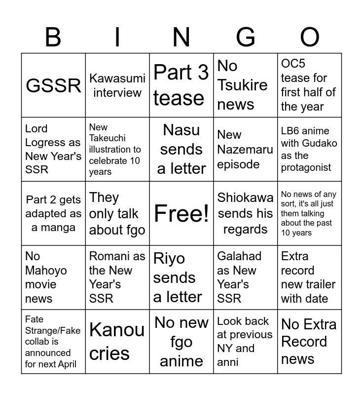 This bingo card has a free space and 24 words: Romani as the New Year's SSR, Kanou cries, Nasu sends a letter, Fate Strange/Fake collab is announced for next April, OC5 tease for first half of the year, GSSR, Lord Logress as New Year's SSR, Kawasumi interview, Shiokawa sends his regards, Riyo sends a letter, New Nazemaru episode, Part 2 gets adapted as a manga, Galahad as New Year's SSR, Extra record new trailer with date, New Takeuchi illustration to celebrate 10 years, Look back at previous NY and anni, No news of any sort, it's all just them talking about the past 10 years, Part 3 tease, LB6 anime with Gudako as the protagonist, They only talk about fgo, No Extra Record news, No Mahoyo movie news, No Tsukire news and No new fgo anime.