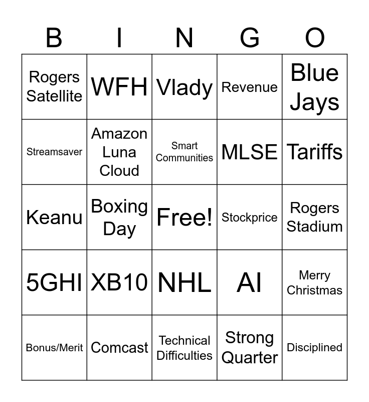This bingo card has a free space and 24 words: XB10, Comcast, Smart Communities, Bonus/Merit, Blue Jays, Rogers Satellite, Streamsaver, WFH, Stockprice, NHL, MLSE, Keanu, AI, Merry Christmas, Amazon Luna Cloud, Strong Quarter, Rogers Stadium, Vlady, Tariffs, Boxing Day, Disciplined, 5GHI, Revenue and Technical Difficulties.