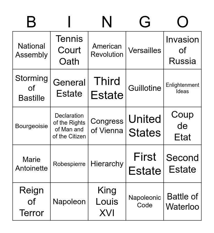 This bingo card has a free space and 24 words: Robespierre, Napoleon, Third Estate, Reign of Terror, Invasion of Russia, National Assembly, Storming of Bastille, Tennis Court Oath, United States, Hierarchy, Guillotine, Bourgeoisie, First Estate, Second Estate, General Estate, Napoleonic Code, Coup de Etat, American Revolution, Enlightenment Ideas, Declaration of the Rights of Man and of the Citizen, Battle of Waterloo, Marie Antoinette, Versailles and King Louis XVI.