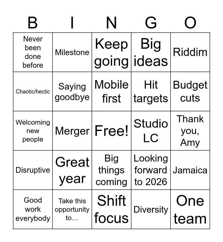This bingo card has a free space and 25 words: Great year, Shift focus, Mobile first, Good work everybody, Riddim, Never been done before, Chaotic/hectic, Milestone, Studio LC, Big things coming, Hit targets, Welcoming new people, Looking forward to 2026, Jamaica, Saying goodbye, Pulled through this year, Thank you, Amy, Keep going, Budget cuts, Merger, One team, Take this opportunity to…, Disruptive, Big ideas and Diversity.