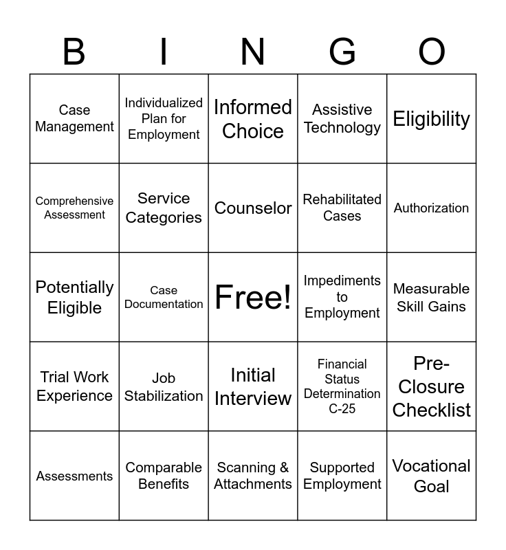 This bingo card has a free space and 31 words: Scanning & Attachments, Post Employment Service, Case Documentation, Employment, Case Management, Informed Choice, Service Categories, Financial Status Determination C-25, Impediments to Employment, Supported Employment, Measurable Skill Gains, Vocational Goal, S.A.V.E., Application, Authorization, Pre-Employment Transition Services, Pre-Closure Checklist, Job Stabilization, Trial Work Experience, Initial Interview, Eligibility, Transition, Assessments, Individualized Plan for Employment, Rehabilitated Cases, Comprehensive Assessment, Assistive Technology, Potentially Eligible, Comparable Benefits, Counselor and Technician.