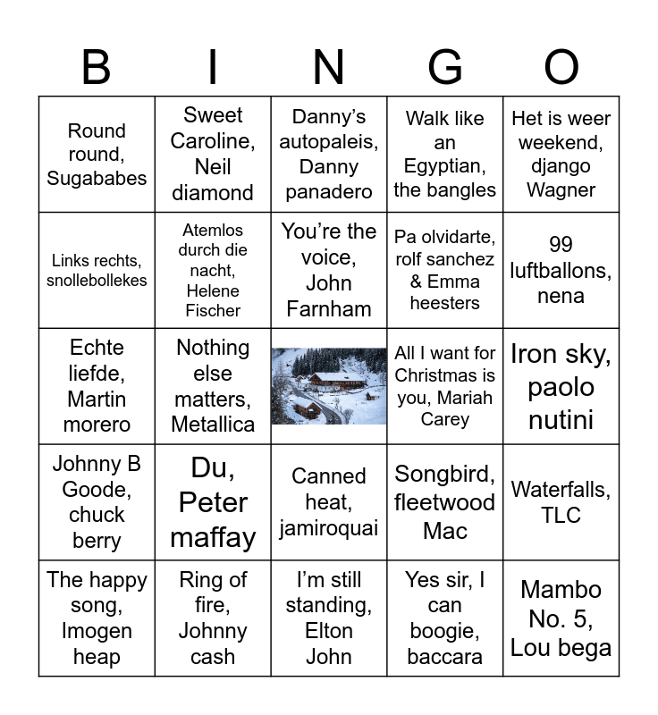 This bingo card has a free space and 80 words: Christmas, Wham, Homegrown tomatoes, John Denver, Danny’s autopaleis, Danny panadero, Schijn ‘n lichtje op mij, Drukwerk, Vier zomers lang, Dirk meeldijk, If I could turn back time, Cher, Go your own way, fleetwood Mac, Why tell me why, Anita Meyer, Belgie…, het goede doel, Creep, radiohead, The sun is shining down, JJ Grey & mofro, Tragedy, Bee Gees, Walk like an Egyptian, the bangles, Round round, Sugababes, Wa trèkte aon?! , veul gère, Links rechts, snollebollekes, Dancing queen, ABBA, Du, Peter maffay, So lonely, the police, Iron sky, paolo nutini, Anton aus Tirol, DJ Ötzi, Het is weer weekend, django Wagner, Echte liefde, Martin morero, You’re the voice, John Farnham, Atemlos durch die nacht, Helene Fischer, Kerst met de fam, merol, Baila de gasolina, effe serieus, Broodje worst, Hans Teeuwen, Wackelkontakt, oimara, Nein, Mann! , laserkraft 3D, 99 luftballons, nena, Du hast, Rammstein, I’m still standing, Elton John, Never too much, Luther vandross, The happy song, Imogen heap, All I want for Christmas is you, Mariah Carey, Smalltown boy, bronski beat, Take on me, a-ha, One day, bakermat, Mambo No. 5, Lou bega, A horse with no name, America & George Martin, If I tell you, rene le blanc, Annabel, Hans de booij, Ich bin wie du, marianne Rosenberg, Just give me a reason, pink, Sweet Caroline, Neil diamond, Per spoor, Guus Meeuwis, Green green grass of home, Tom jones, I feel the earth move, Carole king, Easy, faith no more, Waterfalls, TLC, Nothing else matters, Metallica, Songbird, fleetwood Mac, Jan Klaassen de trompetter, Rob de Nijs, Echte liefde is te koop, Samuel Welten, Der alte dessauer, original zillertaler, Sexy als ik dans, nielson, Joke stop toch met koken, de leidse sleutelgaten, Licht uit, de opposites, Canned heat, jamiroquai, Pa olvidarte, rolf sanchez & Emma heesters, Lotje, lustrum u.v.s.v / n.v.v.s.u, Don’t you want me, the human league, Dance wiv me, dizzee rascal en calvin Harris, Golden, HUNTR/X, Gold, spandau ballet, Gimme! Gimme! Gimme! , ABBA, Ma quale idea, Pino D’angió, Rasputin, boney M, Ain’t no mountain high enough, Marvin gaye, Johnny B Goode, chuck berry, Ring of fire, Johnny cash, I’m gonna be (500 miles), the proclaimers, Don’t stop believin, journey, Escape, Rupert holmes, Dani California, red hot chilipeppers, Yes sir, I can boogie, baccara, Country roads, Hermes house band, Angels, robbie Williams and Hilversum 3, Herman van veen.
