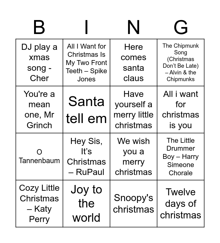 This bingo card has 53 words: Free!, Cozy Little Christmas – Katy Perry, Christmas Lights – Coldplay, It’s Christmas Time Again – Backstreet Boys, 8 days of christmas – Destiny’s Child, Santa Baby - eartha kit, All I Want for Christmas Is My Two Front Teeth – Spike Jones, Silent Night, Santa tell em, Hark! The herald angels sing, Have yourself a merry little christmas, Jingle bell rock, Silver bells, Rudolph the rednosed reindeer, Sleigh ride, Feliz navidad, All i want for christmas is you, Joy to the world, O christmas tree, You're a mean one, Mr Grinch, The Little Drummer Boy – Harry Simeone Chorale, Snowman - Sia, O Tannenbaum, DJ play a xmas song - Cher, I was mommy kissing santa claus, Thank god it's christmas - Queen, Xmas - kylie minogue, Away in a manger, Run run rudolph, Hey Sis, It’s Christmas – RuPaul, LAst christmas, It's beginning to look a lot like christmas, Let it snow let it snow let it snow, Mistletoe - Justin Bieber, Underneath the tree, Grandma got run over by a reindeer, The Chipmunk Song (Christmas Don’t Be Late) – Alvin & the Chipmunks, Christmas Tree Farm – Taylor Swift, Here comes santa claus, I'll be home for christmas, Frosty the snowman, Santa claus is coming to town, Snoopy's christmas, Holly jolly xmas, Do they know it's christmas, Like It’s Christmas – Jonas Brothers, Deck the halls, Jingle bells, We wish you a merry christmas, Twelve days of christmas, White christmas, Rocking around the christmas tree and Jingle Bells (Batman Smells).