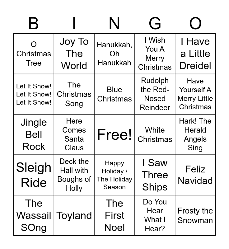 This bingo card has a free space and 42 words: A Holly Jolly Christmas, Blue Christmas, Carol of the Bells, Deck the Hall with Boughs of Holly, Do You Hear What I Hear?, Feliz Navidad, Frosty the Snowman, Good King Wenceslas, Hanukkah, Oh Hanukkah, Happy Holiday / The Holiday Season, Hark! The Herald Angels Sing, Have Yourself A Merry Little Christmas, Here Comes Santa Claus, I Have a Little Dreidel, I Saw Mommy Kissing Santa Claus, I Saw Three Ships, It's Beginning to Look Like Christmas, Jingle Bell Rock, Jingle Bells, Joy To The World, Let It Snow! Let It Snow! Let It Snow!, Little Saint Nick, My Favorite Things, O Christmas Tree, O Holy Night, Rockin' Around the Christmas Tree, Rudolph the Red-Nosed Reindeer, Run Rudolph Run, Santa Baby, Silent Night, Silver Bells, Sleigh Ride, The Christmas Song, The First Noel, The Holly And The Ivy, The Wassail SOng, Toyland, White Christmas, Winter Wonderland, You're A Mean One, Mr. Grinch, I Wish You A Merry Christmas and The Little Drummer Boy.