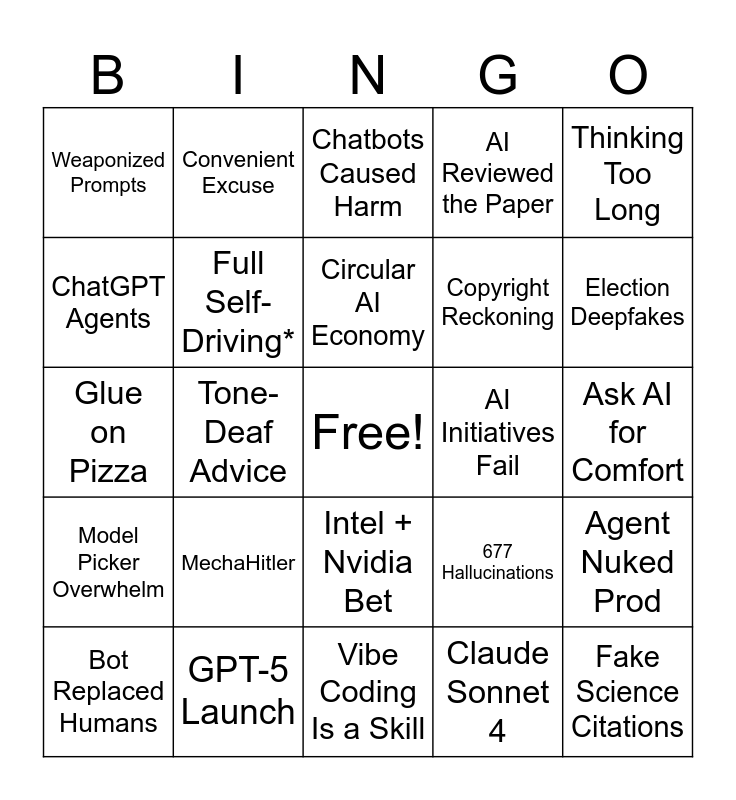 This bingo card has a free space and 72 words: AI Took the Jobs, Convenient Excuse, Tone-Deaf Advice, Media Blamed the Bot, AI Wrote the Headlines, Fake Books Printed, AI Reviewed the Paper, Hallucinated Citations, Copyright Reckoning, Music vs Machines, Bot Replaced Humans, Politicians Blame AI, Election Deepfakes, Weaponized Prompts, No New Hires, Glue on Pizza, 677 Hallucinations, Thinking Too Long, A1 Teaching, Ask AI for Comfort, MechaHitler, Fake Science Citations, Agent Nuked Prod, Doritos = Gun, AI Slop Crisis, Pizza Rolls CEO, Math Is Optional, Not Named Rufus, Thanks for Pointing That Out, Smart Hippos, GPT-5 Launch, GPT-5.1 Upgrade, GPT-5.2 Code Red, Gemini 3 Drops, Claude Sonnet 4, Claude 4.5 Wins Coding, OpenAI Browser, Ghibli AI Craze, ChatGPT Agents, AMD Pops 25%, Intel + Nvidia Bet, DeepSeek Shockwave, $820B Wiped Out, Claude 3.7 Leap, Lovable Hits $100M, Model Picker Overwhelm, Which AI Do We Use?, API Cost Anxiety, Extended Thinking Mode, Multimodal Everything, Search Wars, What’s Our AI Story?, Just Add AI, AI Initiatives Fail, AI Slop Flood, Late-Stage Bubble, Chatbots Caused Harm, Circular AI Economy, $4T Company, AI Was the Answer, Friend Wearable Failed, AI Is Sentient?, My AI Loves Me, Vibe Coding Is a Skill, Vibe Games Hype, Live-Coded on Stage, Full Self-Driving*, Spark of AGI, Powered by AI, Claude Knows, Emergent Behavior and New Physics Dropped.