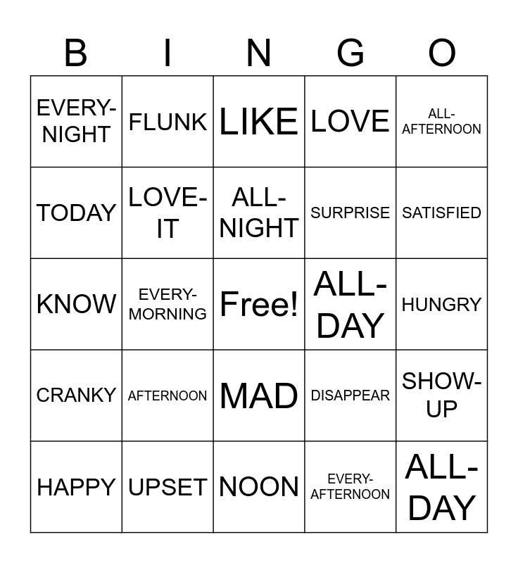 This bingo card has a free space and 48 words: DAY, ALL-DAY, MORNING, NOON, AFTERNOON, NIGHT, FLUNK, WORRY, TODAY, TEST, LOVE-IT, LOVE, SHOW-UP, DISAPPEAR, DO-WHAT?, DAILY/EVERYDAY, ALL-NIGHT, ALL-DAY, ALL-MORNING, ALL-AFTERNOON, EVERY-MORNING, EVERY-AFTERNOON, EVERY-NIGHT, SURPRISE, ENTHUSIASTIC, SATISFIED, HAPPY, SAD, MAD, CRANKY, ANGRY, WOW, EXCITED, NERVOUS, UPSET, SO-SO, SLEEPY, HUNGRY, TIRED, SICK, INTEREST, FEELINGS, LIKE, WANT, KNOW, DON'T-LIKE, DON'T-WANT and DON'T-KNOW.