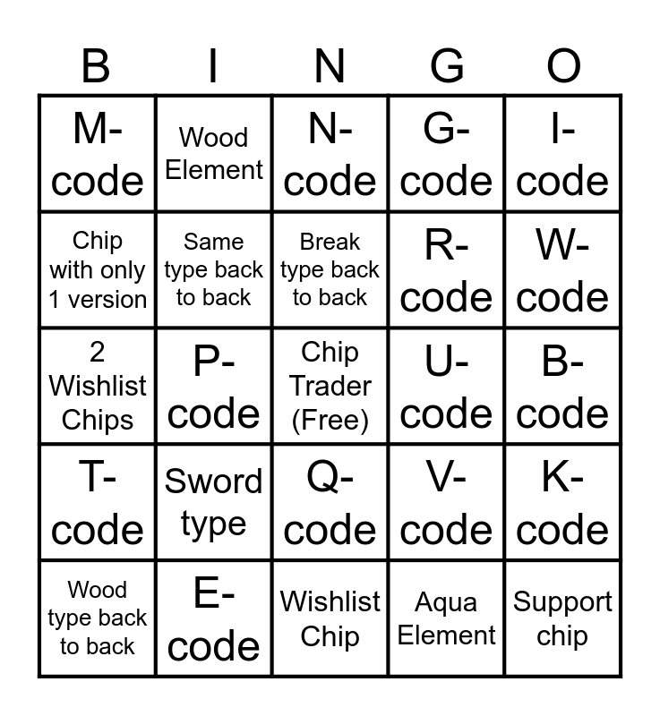 This bingo card has a free space and 70 words: A-code, B-code, C-code, D-code, E-code, F-code, G-code, H-code, I-code, J-code, K-code, L-code, M-code, N-code, O-code, P-code, Q-code, R-code, S-code, T-code, U-code, V-code, W-code, Y-code, Z-code, *-code, Null Element, Heat Element, Aqua Element, Elec Element, Wood Element, Back to Back Same Chip, Back to Back Same Code, Standard Chip, Mega Chip, Navi Chip, V1 Chip, V2 Chip, V3 Chip, Chip with only 1 version, Object type, Sword type, Support chip, Break type, Wind type, Same type back to back, Wood type back to back, Elec type back to back, Heat type back to back, Object type back to back, Plus type, Recovery type, Aqua type back to back, Sword type back to back, Wishlist Chip, Support chip back to back, Break type back to back, Wind type back to back, Recovery type back to back, Plus type back to back, 2 Wishlist Chips, 3 Wishlist Chips, 4 Wishlist Chips, Time Freeze Chip, Multi-Hit Chip, 100-150 Power, 40> Power, Exactly 100 Power, 40-100 Power and 150< Power.