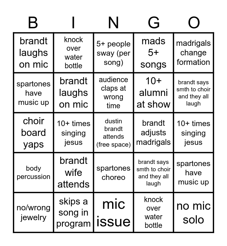 This bingo card has a free space and 54 words: knock over water bottle, body percussion, song starts over, SAME HANUKKAH MEDLEY, spartones choreo, 5+ people sway (per song), mads 5+ songs, choir board yaps, spartones have music up, not in windows, brandt laughs on mic, forgets a choir in program, skips a song in program, no/wrong jewelry, brandt wife attends, mic issue, no mic solo, 10+ alumni at show, audience claps at wrong time, 10+ times singing jesus, brandt says smth to choir and they all laugh, step touch, brandt adjusts madrigals, madrigals change formation, knock over water bottle, knock over water bottle, knock over water bottle, knock over water bottle, knock over water bottle, knock over water bottle, body percussion, song starts over, SAME HANUKKAH MEDLEY, spartones choreo, 5+ people sway (per song), mads 5+ songs, choir board yaps, spartones have music up, not in windows, brandt laughs on mic, forgets a choir in program, skips a song in program, no/wrong jewelry, dustin brandt attends, brandt wife attends, mic issue, no mic solo, 10+ alumni at show, audience claps at wrong time, 10+ times singing jesus, brandt says smth to choir and they all laugh, step touch, brandt adjusts madrigals and madrigals change formation.