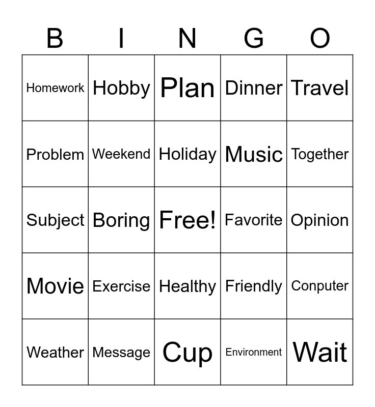 This bingo card has a free space and 24 words: Exercise, Message, Holiday, Weather, Travel, Homework, Problem, Hobby, Favorite, Healthy, Music, Subject, Friendly, Conputer, Weekend, Environment, Opinion, Plan, Together, Boring, Wait, Movie, Dinner and Cup.