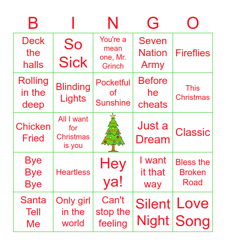 This bingo card has a free space and 29 words: Santa Tell Me, Hallelujah, All I want for Christmas is you, Run Rudolph Run, Deck the halls, You're a mean one, Mr. Grinch, Blinding Lights, Heartless, Just a Dream, Only girl in the world, Classic, Love Song, Can't stop the feeling, Silent Night, This Christmas, Low, Hey ya!, Bye Bye Bye, Fireflies, Chicken Fried, I want it that way, Fire Burning, Before he cheats, Rolling in the deep, Seven Nation Army, So Sick, Bless the Broken Road, Pocketful of Sunshine and Beautiful Soul.